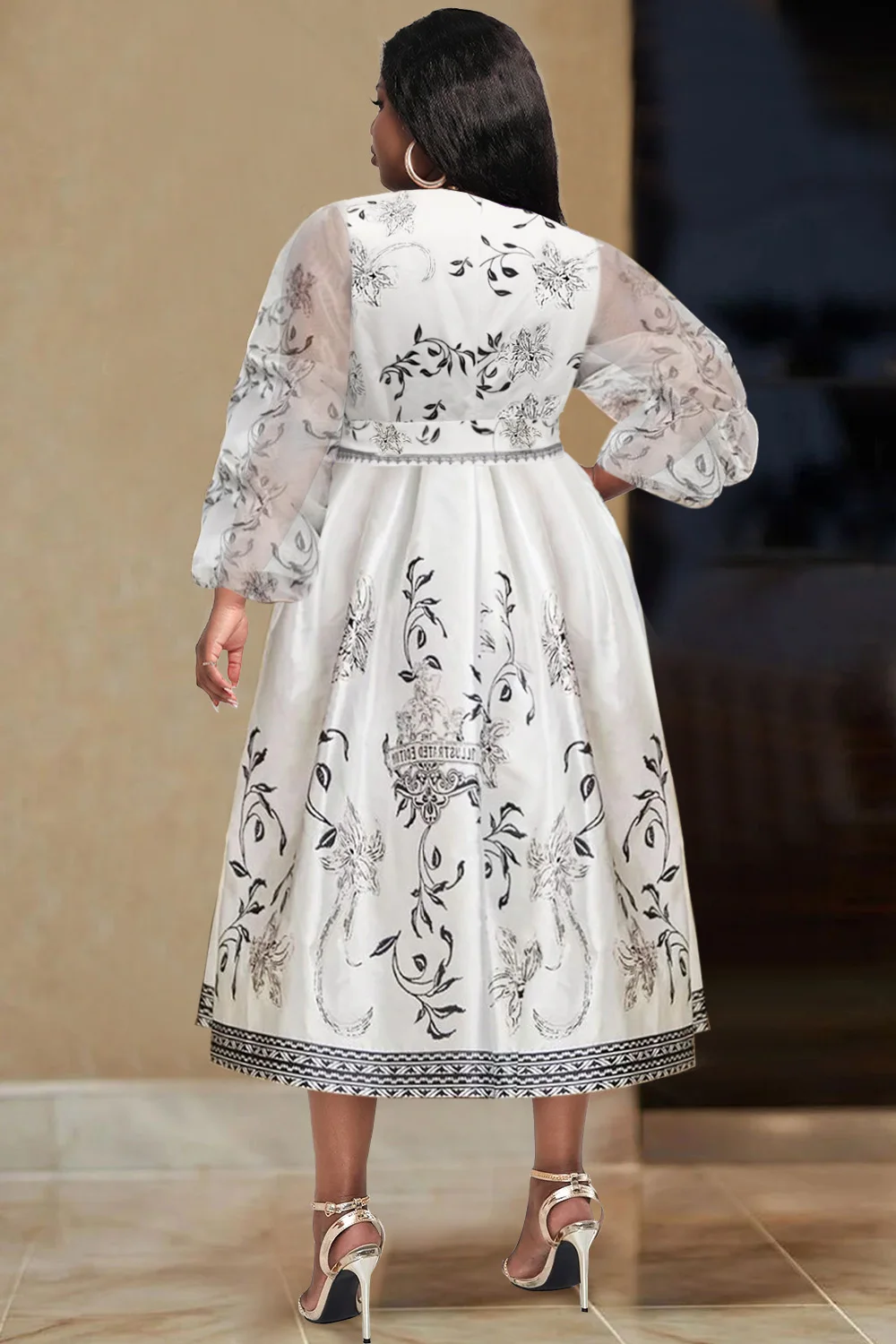 Plus Size Business Casual White Floral Wrap Neck Lantern Sleeve Long Sleeve Pocket Satin Midi Dresses