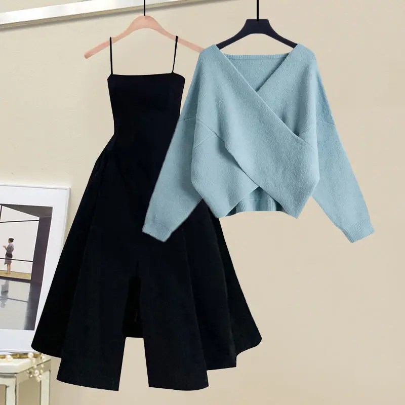 Plus Size Womens Clothing Knitted Pullover Sweater Sexy Sling Dress Two Pieces Sets Solid Fashion Casual