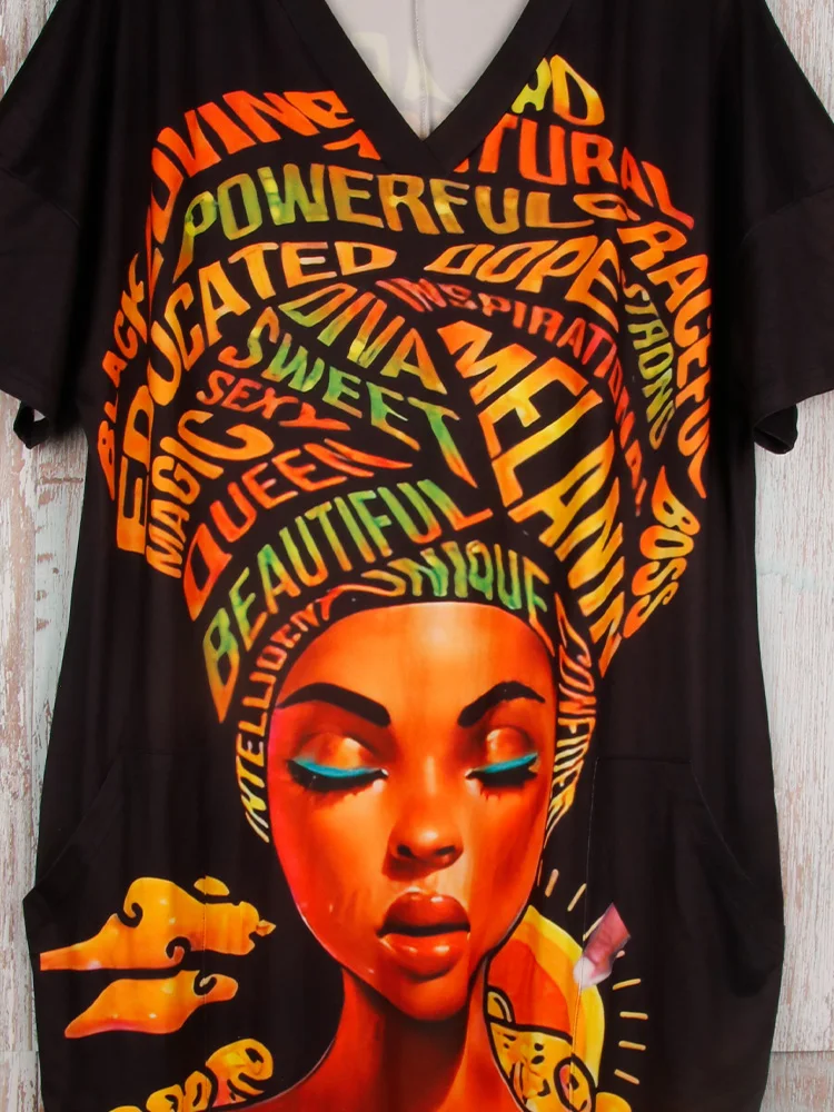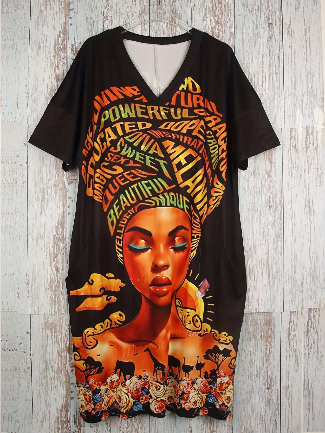 Plus-size women's dress casual fashion printed loose V-neck short-sleeved dress plus-size women's clothing